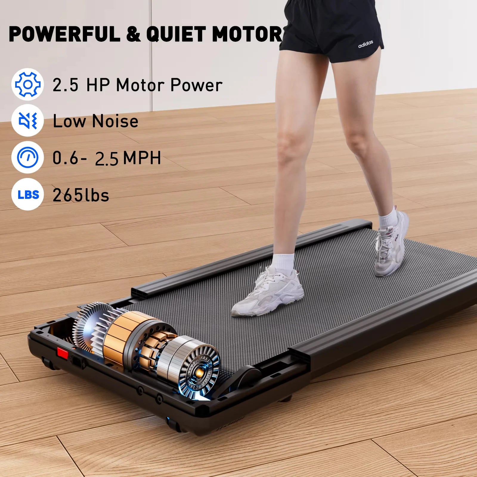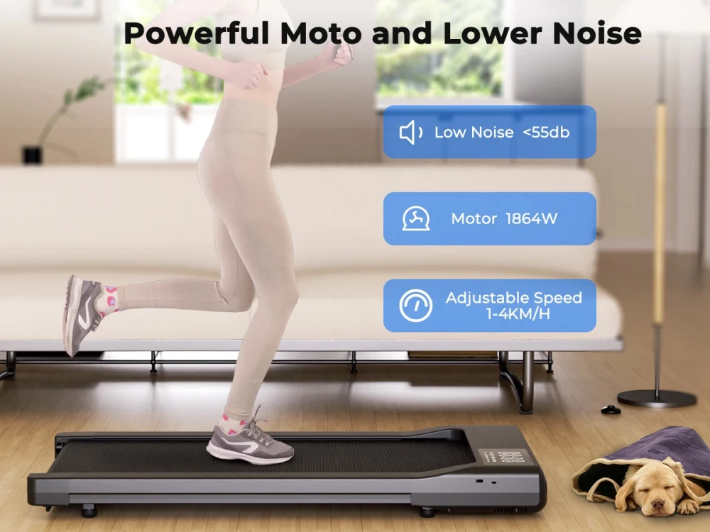 Avec une puissance de 2.5HP (1864W) et une vitesse maximale de 4 km/h (2.5 MPH), adaptez facilement l’intensité à vos besoins. Le contrôle se fait simplement via une télécommande fournie, pour ajuster votre rythme sans interrompre votre travail.Silencieux, stable et résistant